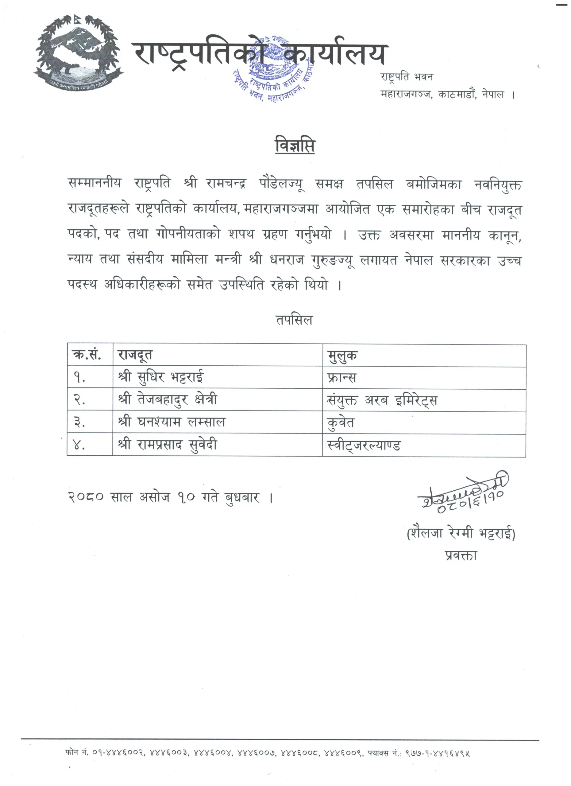 समारोहमा फ्रान्सका लागि सुधीर भट्टराई, संयुक्त अरब एमिरेट्सका लागि तेजबहादुर क्षेत्री, कुवेतका लागि घनश्याम लम्साल र स्वीटजरल्याण्डका लागि रामप्रसाद सुवेदीले शपथ ग्रहण गरेका छन् ।