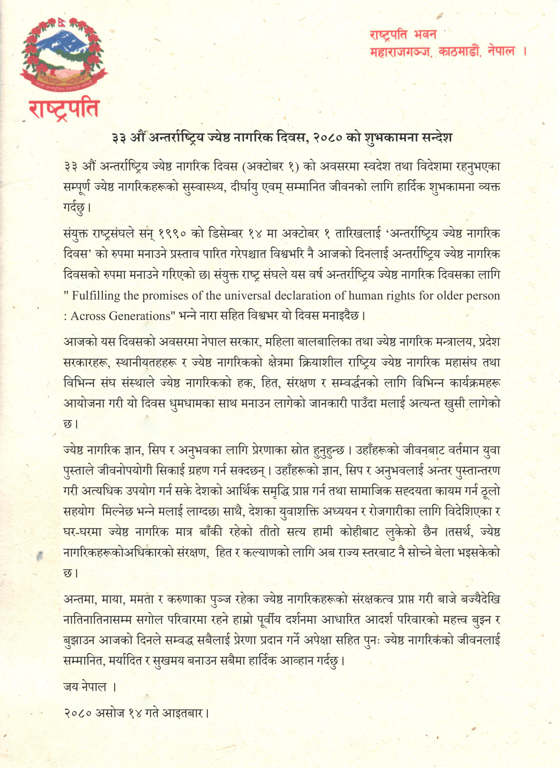 आइतबार ३३औँ अन्तर्राष्ट्रिय ज्येष्ठ नागरिक दिवसको अवसरमा शुभकामना सन्देश जारी गर्दै उनले स्वदेश तथा विदेशमा रहेका सम्पूर्ण ज्येष्ठ नागरिकहरूको सुस्वास्थ्य, दीर्घायु एवं सम्मानित जीवनको लागि शुभकामना व्यक्त गरेका छन् ।
