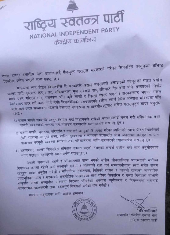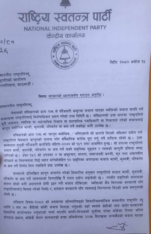 संविधान दिवसका अवसरमा बाँकी कैद मिनाहा गरिएको विषयमा सरकारको ध्यानाकर्षण गराइदिने अनुरोध गर्न आएका राष्ट्रिय स्वतन्त्र पार्टीका सभापति रवि लामिछानेसहितको प्रतिनिधिमण्डलसँग राष्ट्रपति पौडेलले संसदीय व्यवस्थाको मान्यता अनुसार मन्त्रिपरिषदले गरेको निर्णयको जस अपसजको भागी सरकार नै हुने भएकोले सरकारलाई नै प्रश्न गर्न आग्रह गरे।