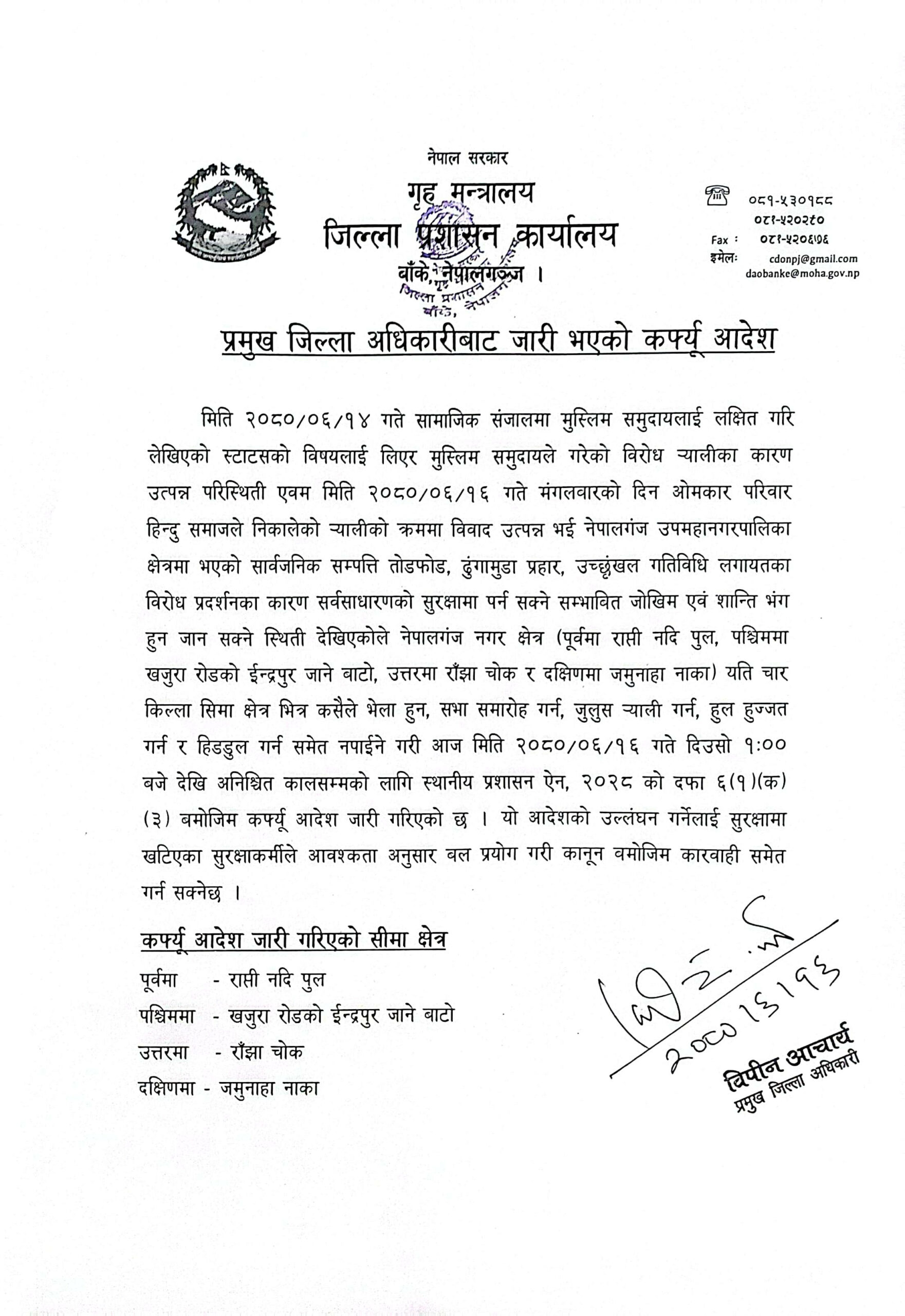 हिन्दु र मुस्लिम समुदायबीच तनाव सिर्जना हुने संकेत देखिएपछि नेपालगञ्ज उपमहानगरपालिका क्षेत्रमा प्रशासनले कर्फ्यु लगाएको हो ।