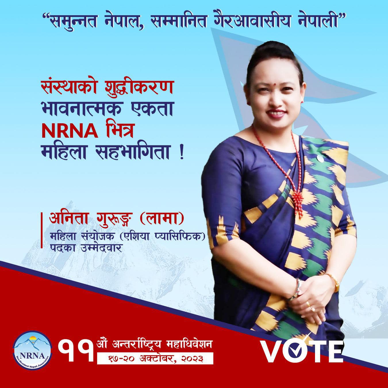 एनआरएनए अभियानमा लामो समयदेखि आबद्ध गुरुङले एनआरएनए एसिया प्यासिफिक महिला संयोजक पदमा उम्मेदवारी दिने घोषणा गरेकी हुन् ।