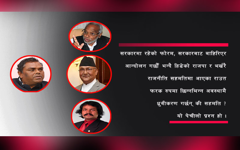 सरकारमा रहेको फोरम, सरकारबाट बाहिरिएर आन्दोलन गर्छौं भन्दै हिडेको राजपा र भर्खरै राजनीति सहमतिमा आएका राउत फरक रुपमा छिन्नभिन्न अवस्थामै ध्रुवीकरण गर्छन् की सहमति ? यो पेचीलो प्रश्न हो ।