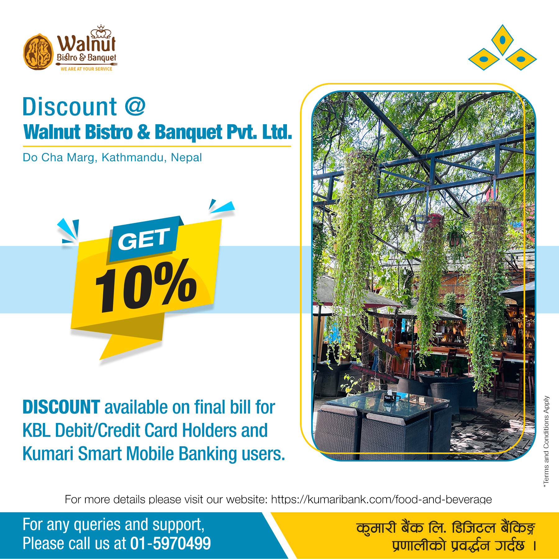 डिजिटल कारोबारमा ग्राहकहरू आकर्षित भइरहेकोे कुरालाई मध्यनजर गर्दै आफ्ना ग्राहकहरूलाई डिजिटल कारोबारमा प्रोत्साहन गर्नका निमित्त कुमारी बैंकले यस सहकार्य मार्फत वलनट बिस्ट्रो एण्ड ब्यानक्वेटमा आकर्षक छुटको प्रावधान गरेको हो ।