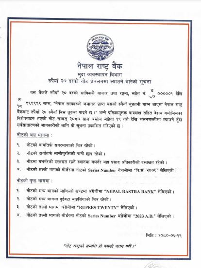 राष्ट्र बैंकले शुक्रबार सूचना जारी गर्दे साविककै आकार तथा रंगमा २० रुपैयाँ दरको नयाँ नोट प्रचलनमा ल्याउन लागेको जानकारी दिएको छ ।