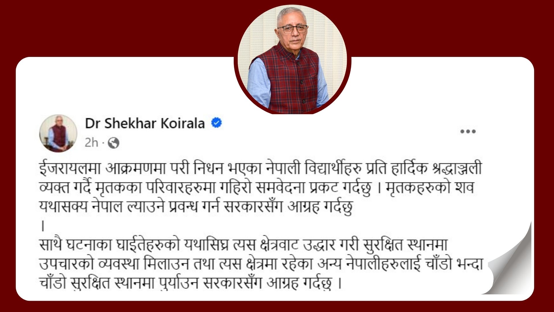 सोमबार सामाजिक सञ्जाल फेसबुकमार्फत उनले घटनामा घाइतेहरूको यथाशीघ्र उद्धार गरी सुरक्षित स्थानमा उपचारको व्यवस्था मिलाउन पनि आग्रह गरेका हुन् । उनले लेखेका छन्,‘ईजरायलमा आक्रमणमा परी निधन भएका नेपाली विद्यार्थीहरु प्रति हार्दिक श्रद्धाञ्जली व्यक्त गर्दै मृतकका परिवारहरुमा गहिरो समवेदना प्रकट गर्दछु । मृतकहरुको शव यथाशक्य नेपाल ल्याउने प्रवर्धन गर्न सरकारसँग आग्रह गर्दछु ।
