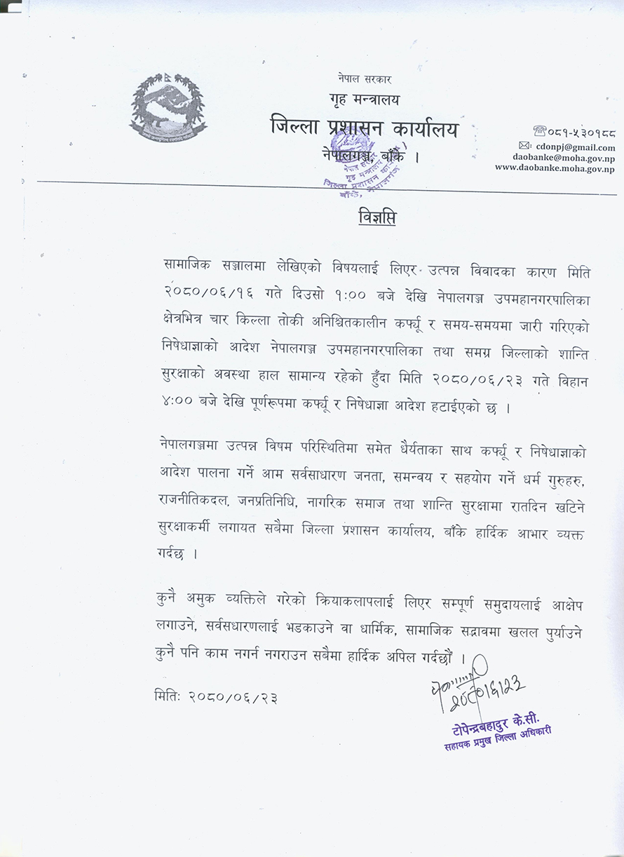 जिल्ला प्रशासन कार्यालय बाँकेले विज्ञप्ति जारी गर्दै असोज १६ गते दिउँसो १ बजेदेखि लगाइएको कर्फ्यू र निषेधाज्ञा आजदेखि पूर्ण रुपमा हटाइएको जनाएको छ ।