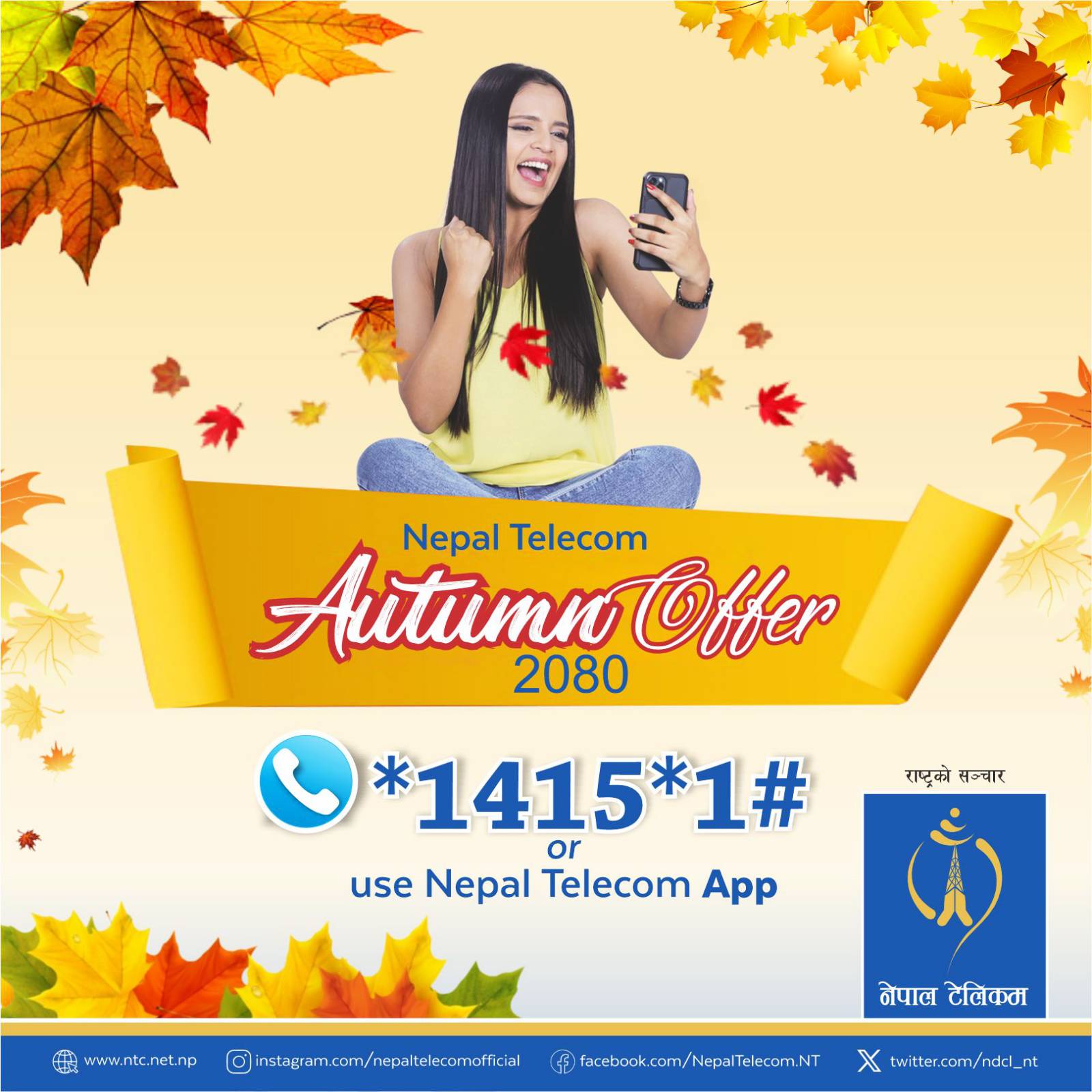 नेपाल टेलिकमएप डाउनलोड गर्दा १ जीबीबोनस डाटाः कम्पनीका सेवाग्राहीले ‘नेपाल टेलिकम ’एप डाउनलोड गरेर चलाउदा १ जीबी डाटा बोनसको रुपमा उपलब्ध हुनेछ । सो डाटा ३ दिनसम्म प्रयोग गर्न सकिने छ । अटम अफर अन्तर्गतका विभिन्न प्याकेज प्राप्त गर्नका लागि ग्राहकले ८ज्ञद्धज्ञछ८ज्ञ३ डायल गर्नुपर्ने छ ।