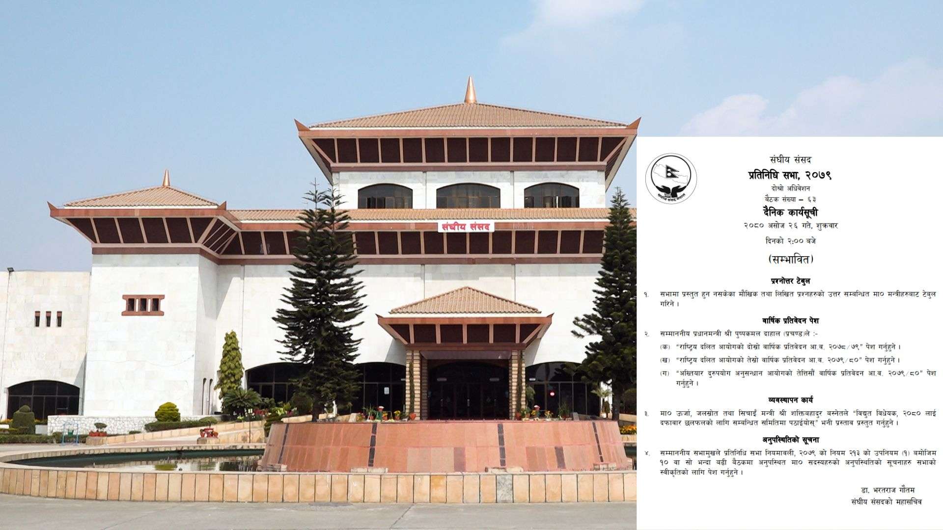 यस्तै ऊर्जा, जलस्रोत तथा सिँचाइमन्त्री शक्तिबहादुर बस्नेतले विद्युत् विधेयक, २०८० दफावार छलफलका लागि सम्बन्धित समितिमा पठाउन प्रस्ताव गर्ने सम्भावित कार्यसूची पनि छ ।