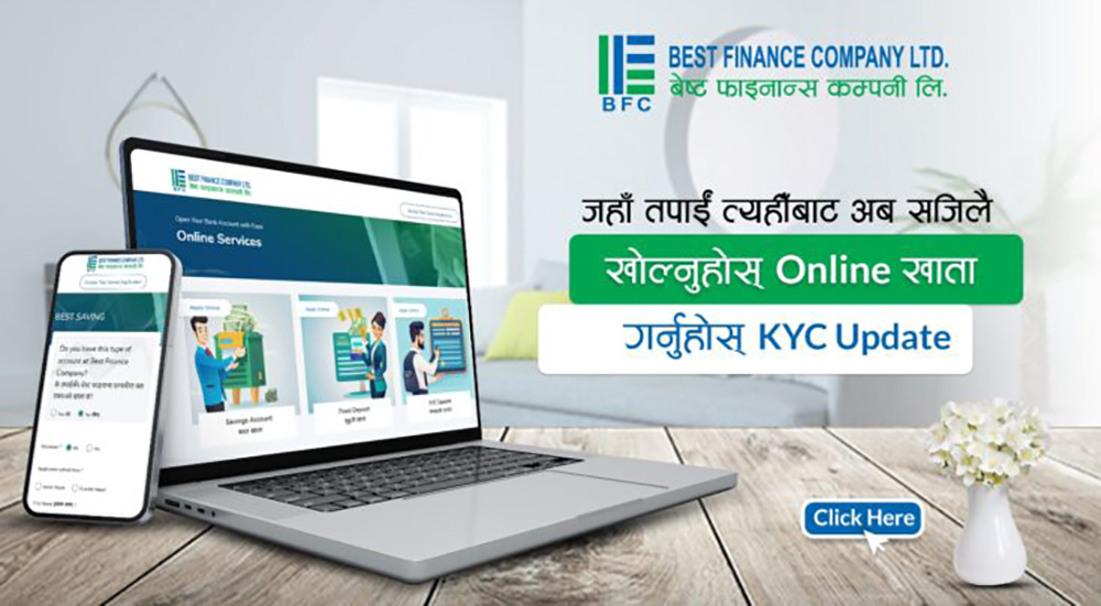 देश र विदेशमा रहेका नेपालीहरुलाई खाता खोली बैकिङ कारोवार गर्न अनलाईन एकाउन्ट ओपनिङ सेवा प्रदान गर्दै आएकोमा, थप बित्तिय सेवाहरु सहित सो सेवालाई स्तरोन्नति गरी अनलाईन एकाउन्ट ओपनिङ सेवा शुरु गरेको बेष्ट फाइनान्स कम्पनीले जनाएको छ ।