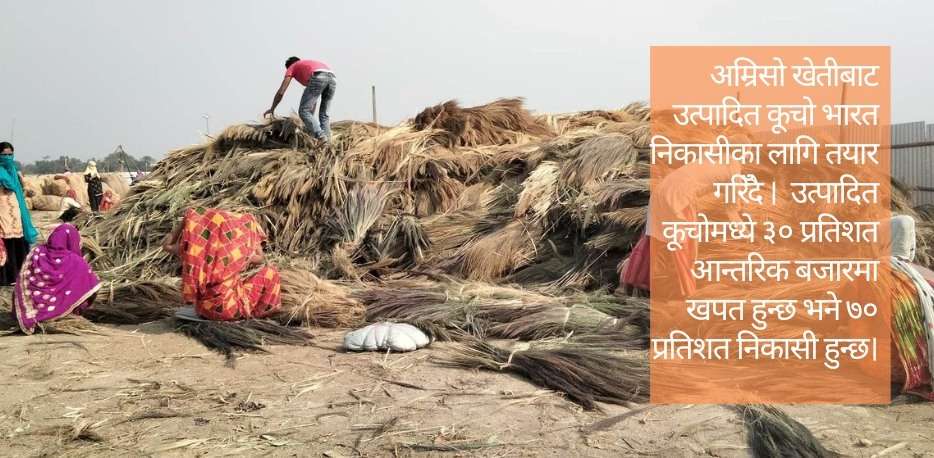 पूर्वको काँकडभिट्टा भन्सारबाट सरदर वार्षिक १ हजार र विराटनगरस्थित भन्सारबाट २ सय ट्रकमा भारत निर्यात हुने गरेको छ । एक ट्रकमा ५० किलोको बण्डलका दरले तीन सय बण्डलसम्म कूचो ढुवानी गरिन्छ ।