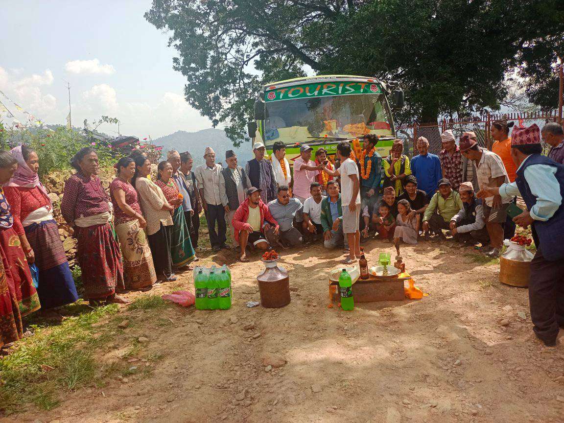 गाउँमा बस पुगेपछि स्थानीयमा खुसीयाली, पूजा गरेर स्वागत