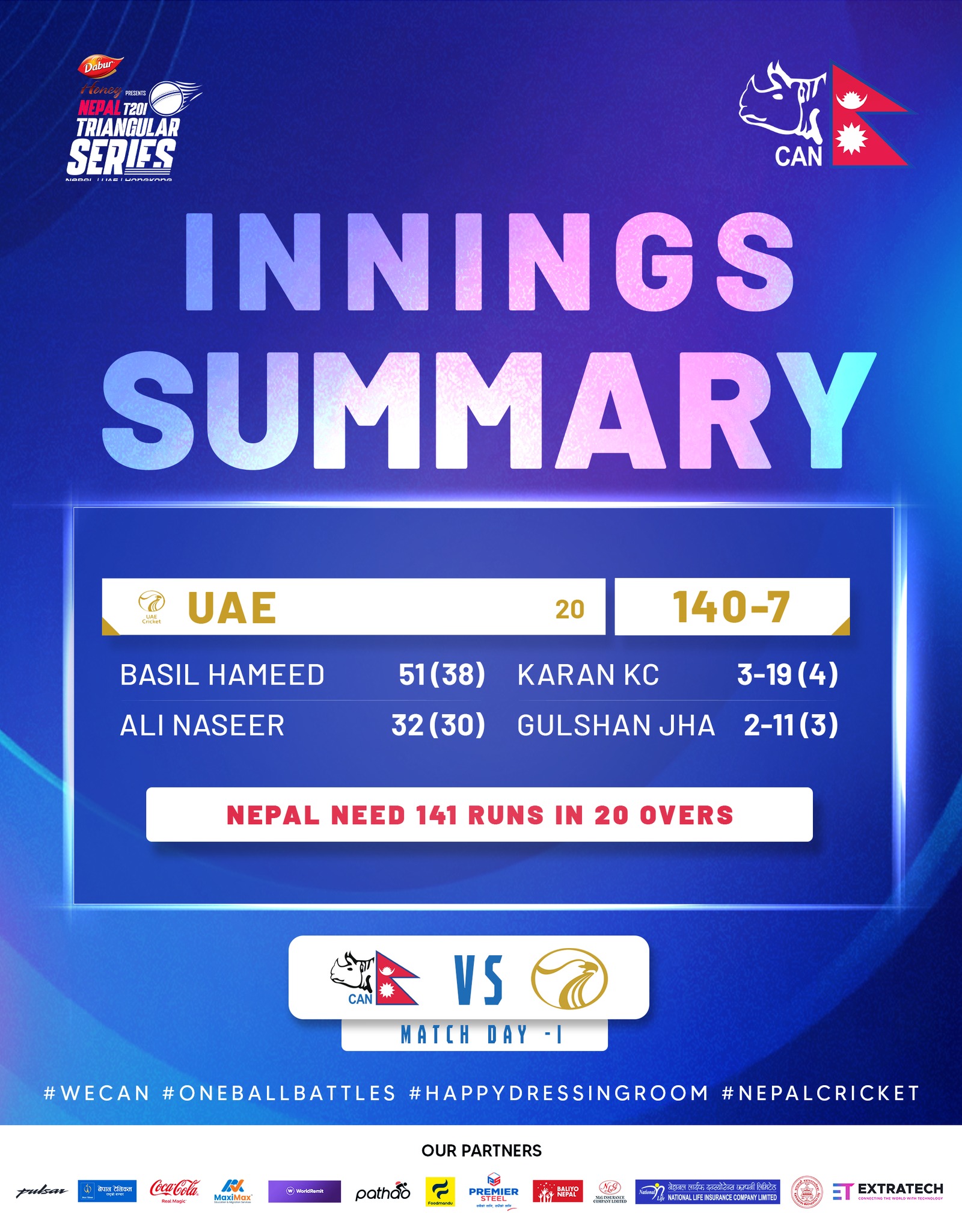 काठमाडौं। त्रिकोणात्मक टी–२० अन्तर्राष्ट्रिय श्रृखलाअन्तर्गत यूएईले नेपाललाई १४१ रनको लक्ष्य दिएको छ।