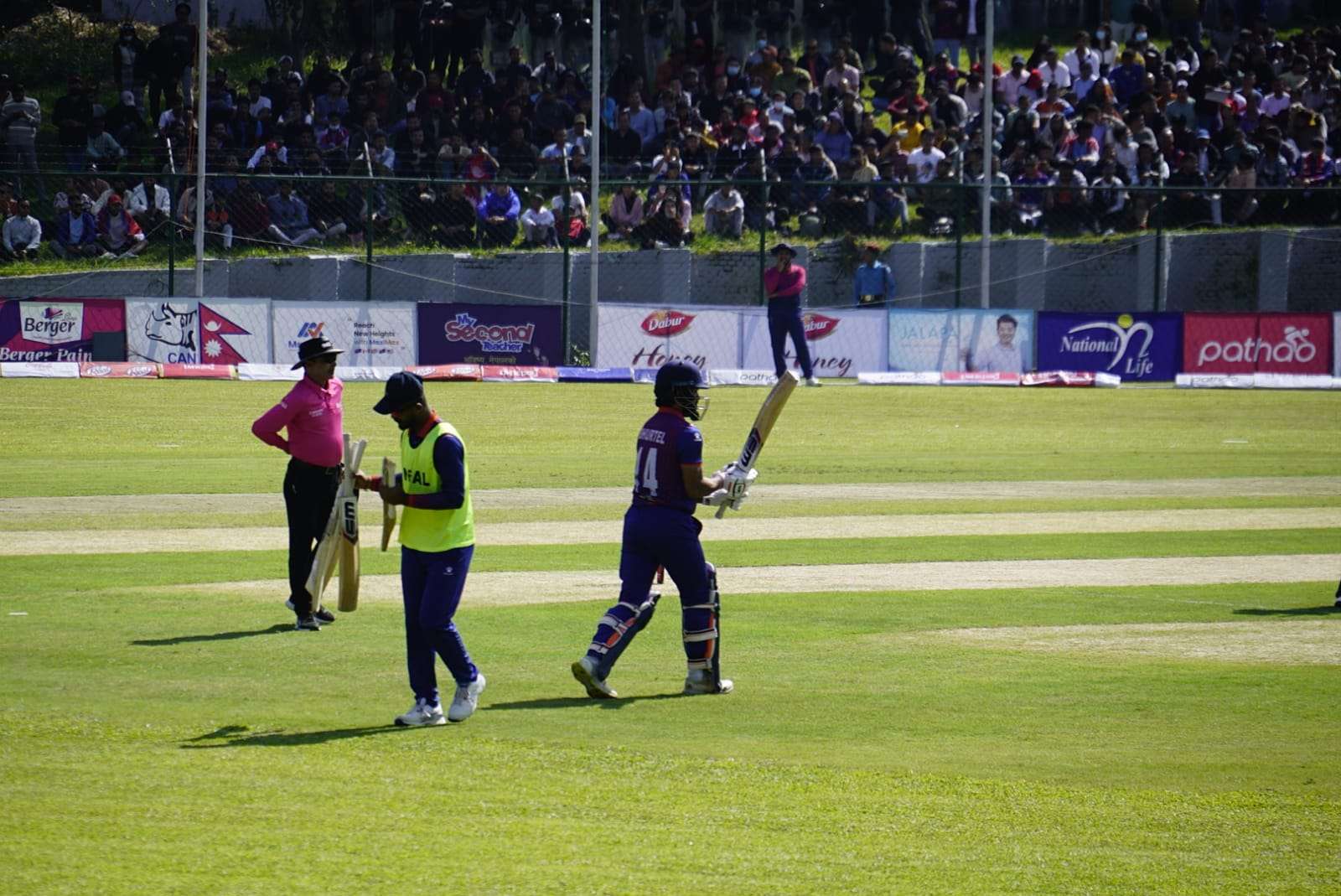 निकै राम्रो व्याटिङ गरिरहेका क्याप्टेन वसीमलाई नेपाली बलर गुल्सन झाले आउट गराए । नेपालका लागि अविनास बोहरा र गुल्सन झाले समान २÷२ विकेट लिए । कुशल मल्ल १ विकेट लिए । २५ बल खेलेर २६ रन जोडेका वृतिया अरविन्द रुद्रावेललाई दिपेन्द्र सिंह ऐरिले रन आउट गराए ।