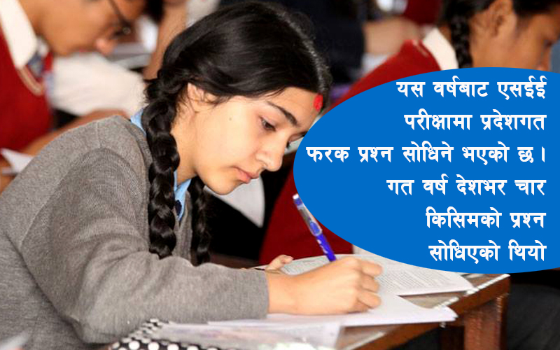 यस वर्षबाट एसईई परीक्षामा प्रदेशगत फरक प्रश्न सोधिने भएको छ । गत वर्ष देशभर चार किसिमको प्रश्न सोधिएको थियो । साधारणतर्फको अनिवार्य छवटा विषयको प्रश्नपत्र प्रदेशगत रूपमा फरक बनाइने भएको हो । प्राविधिक र संस्कृततर्फ सबै प्रदेशमा एकै प्रकारका प्रश्नपत्र रहने छन् ।