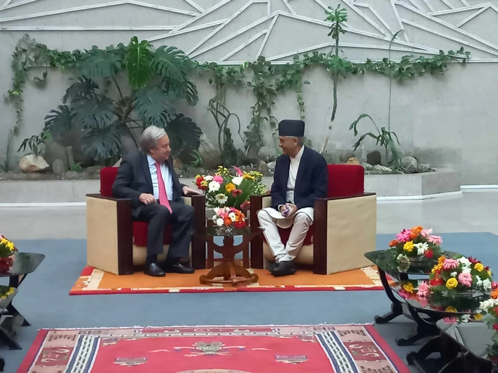 काठमाडौं । नेपालको औपचारिक भ्रमणमा रहेका संयुक्त राष्ट्रसङ्घका महासचिव एन्टोनियो गुटेरेस र नेपाली कांग्रेसका सभापति एवं पूर्वप्रधानमन्त्री शेरबहादुर देउवाबीच भेटवार्ता भएको छ ।