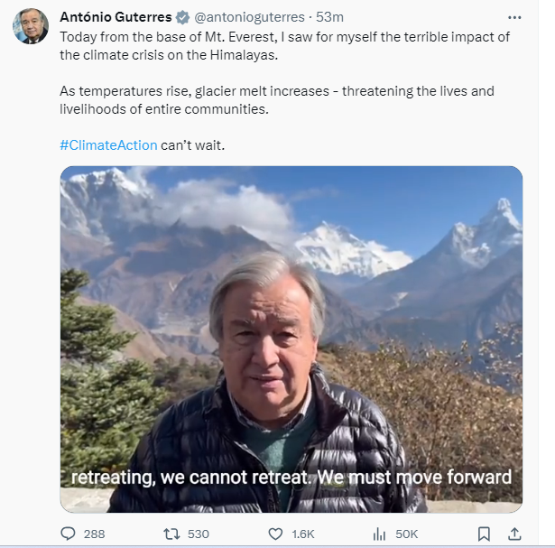 आधिकारीक ट्वीटर ह्याण्डलबाट महासचिव गुटेरेसले आफू माउन्ट एभरेष्टको आधार शिविरमा पुगेको र आफूले हिमालय क्षेत्रमा जलवायु परिर्वतनको गम्भीर असर देखेको बताएका छन् ।
