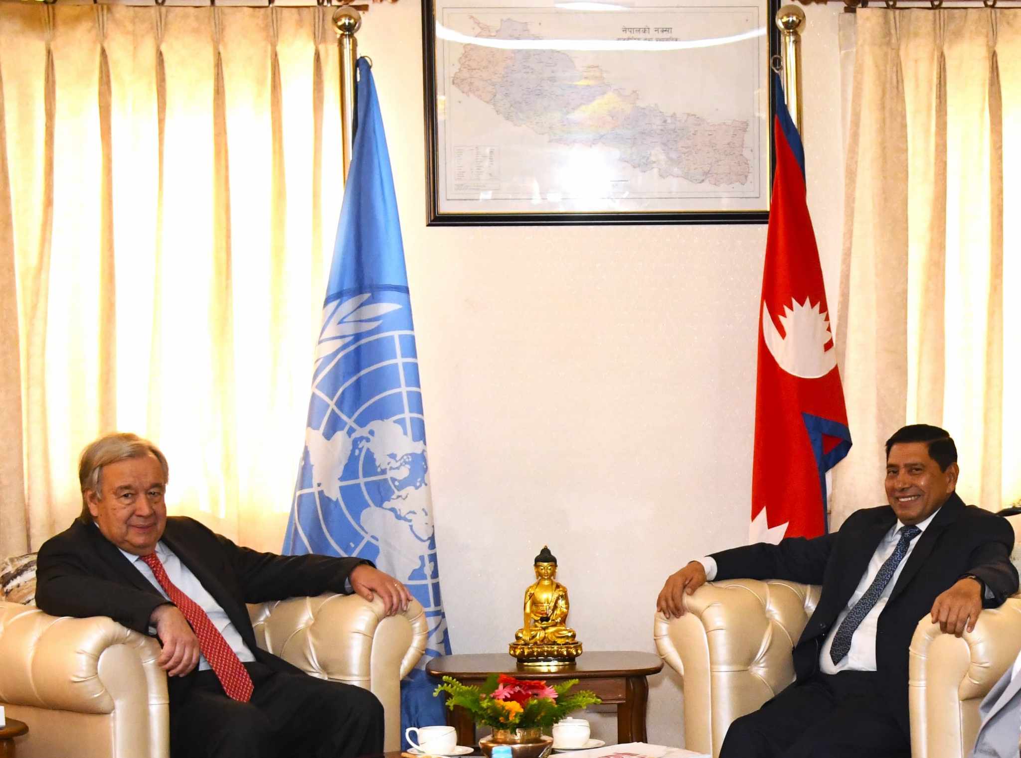 काठमाडौं। नेपालको चारदिने औपचारिक भ्रमणमा रहेका संयुक्त राष्ट्रसंघका महासचिव एन्टोनियो गुटेरेस र उपप्रधानमन्त्री एवम् गृहमन्त्री नारायणकाजी श्रेष्ठबीच आज मंगलबार दिउँसो शिष्टाचार भेटवार्ता भएको छ।