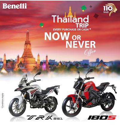 उक्त अफर बेनेलीका सबै मोडलका मोटरसाइकलका लागि मान्य हुनेछ । यसमा ग्राहकहरूले प्रत्येक खरिदमा थाइल्याण्डको निःशुल्क यात्रा वा सो बराबरको नगद छुट, बेनेलीको ब्रान्डेड हेल्मेट र अन्य धेरै उपहार प्राप्त गर्न सक्नेछन् ।