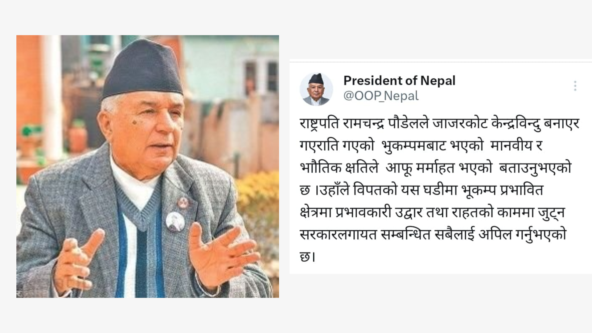 विपद्को यस घडीमा भूकम्प प्रभावित क्षेत्रमा प्रभावकारी उद्धार तथा राहतको काममा जुट्न सरकारलगायत सम्बन्धित सबैलाई अपिल गरेको राष्ट्रपति कार्यालयले जनाएको छ ।