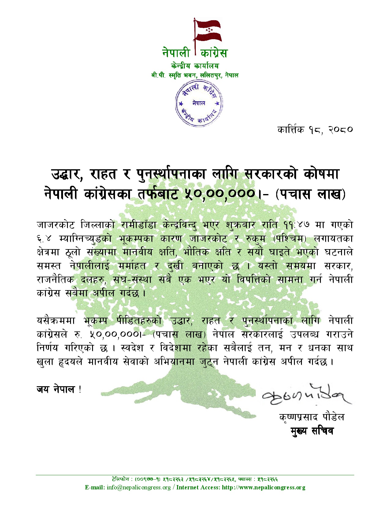 नेपाली कांग्रेसले उद्धार, राहत र पुनस्र्थापनाका लागि सरकारको कोषमा पचास लाख रुपैंयाँ उपलब्ध गराउने निर्णय गरेको मुख्य सचिव कृष्ण पौडेलले जानकारी दिएका  छन् ।