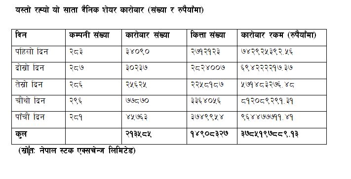 दैनिक सेयर कारोबारको बिश्लेषण गर्दा पहिलो दिन २८ दशमलव १८ अंकले घटेर १८ सय ७५ दशमलव ६५ अंकमा खुम्चिन पुगेको नेप्से दोस्रो दिन भने तीन दशमलव शुन्य चार अंकले बढेर १८ सय ७८ दशमलव ७० अंकमा पुग्न सफल भएको थियो । तेस्र्रो दिन भने १४ दशमलव २९ अंकले घटेर १८ सय ६५ दशमलव ४० अंकमा सिमित हुन पुगेको नेप्से चौंथो दिन पुन पाँच दशमलव ८३ अंकले घटेर १८ सय ५८ दशमलव ५६ अंकमा खुम्चिएको थियो । पाँचौं दिन पनि नेप्से १० दशमलव ८६ अंकले घटेर १८ सय ४७ दशमलव ७० अंकमा सिमित हुन पुगेको थियो ।