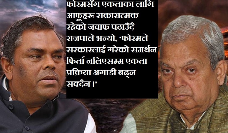 गत फागुन १५ गते एकताका लागि भन्दै फोरमले राजपालाई पत्र पठाएको थियो । सो पत्रको जवाफ लेख्दै राजपाले वार्ता र एकताका लागि सकारात्मक भएपछि सरकार छाड्नुपर्ने शर्त अघि सारेको थियो ।