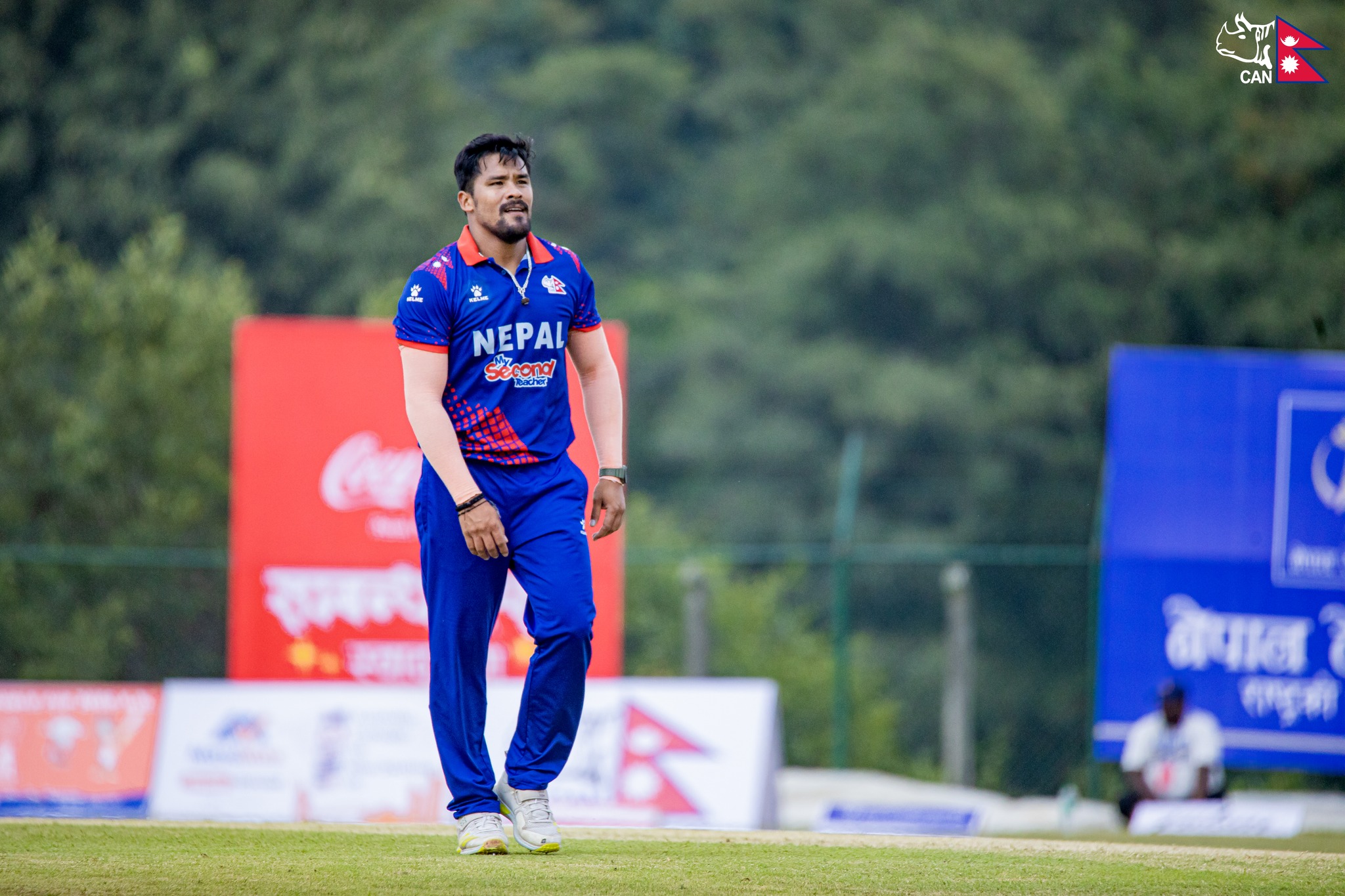 नेपालका बलर करण केसीले ओमानको छैटौँ विकेट लिएका हुन् । ओमानले १७.३ ओभरमा६ विकेट गुमाउदै १५७ रन जोडेको छ ।