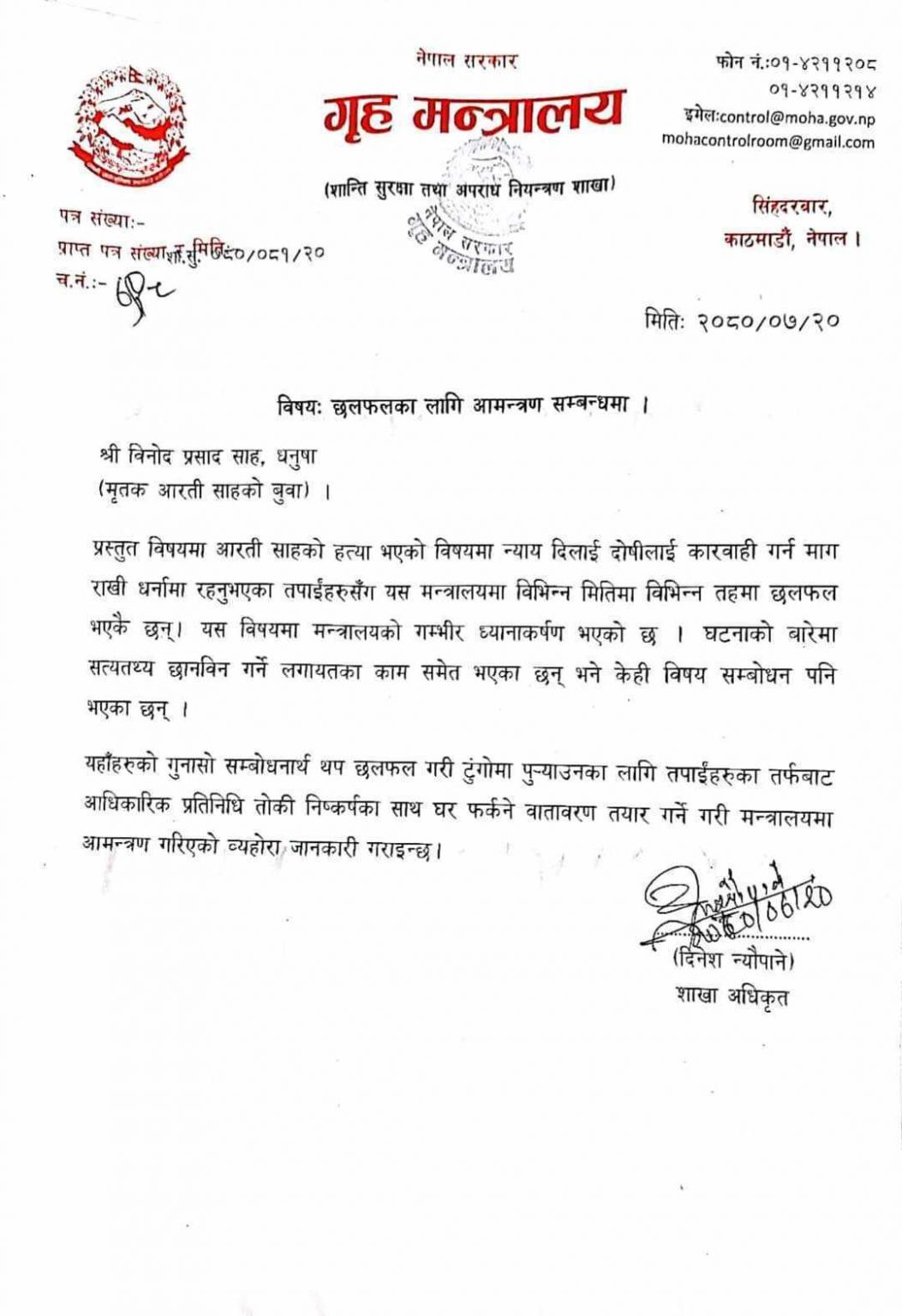 आरतीका बुबा विनोदप्रसाद साहलाई सम्बोधन गर्दै वार्ताका लागि प्रतिनिधि पठाउन गृहले सोमबार पीडित पक्षलाई पत्राचार गरेको छ ।