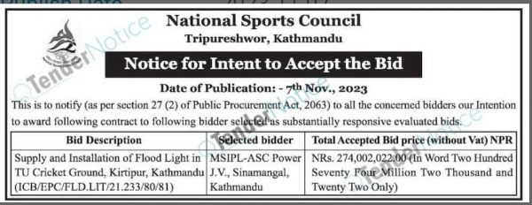 २७ करोड ४० लाख २ हजार २२ रुपैयाँमा उक्त कम्पनीले फ्लड लाइट जडानको ठेक्का पाएको राष्ट्रिय खेलकुद परिषद्९राखेप०ले जनाएको छ ।