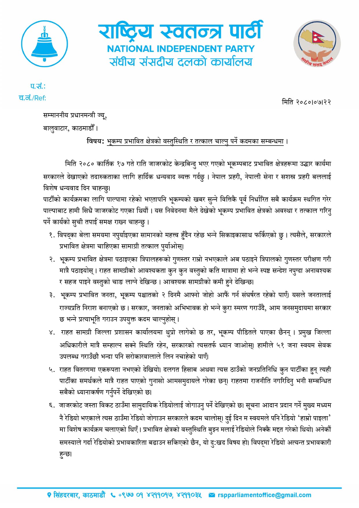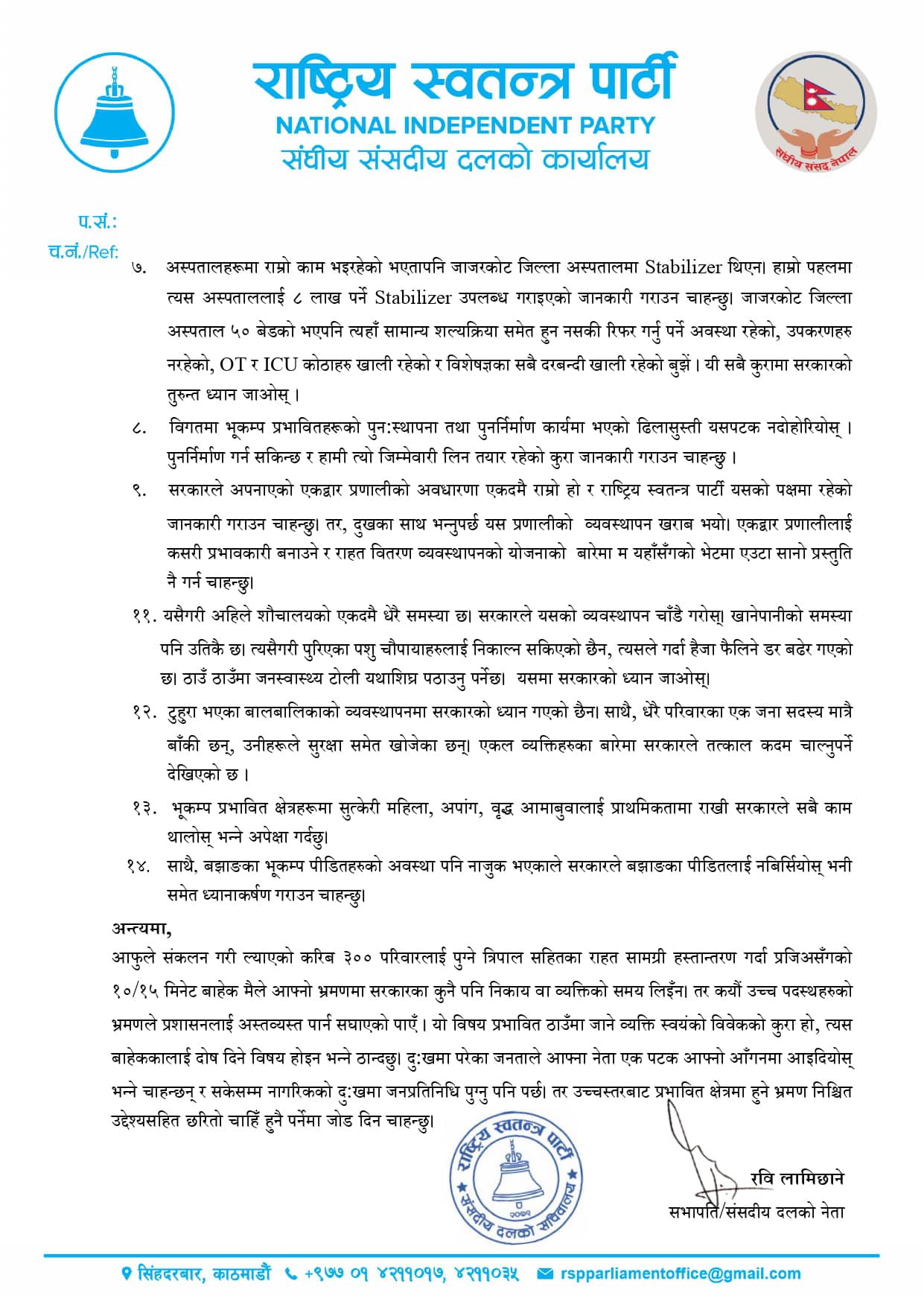 काठमाडौं । राष्ट्रिय स्वतन्त्र पार्टीका सभापति रवि लामिछानेले जाजरकोट र रुकुुम पश्चिमका भूकम्प पीडितहरुको राहत तथा पुनर्निमाणका लागि तत्काल सरकारले ध्यान दिनुपर्नेमा जोड दिएका छन् ।