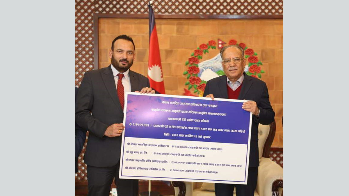 प्राधिकरणका महानिर्देशक प्रदीपकुमार अधिकारीलगायत कर्मचारी बालुवाटार पुगेर प्रधानमन्त्री पुष्पकमल दाहाल ‘प्रचण्ड’ लाई आज बिहान उक्त रकम बराबरको चेक प्रधानमन्त्री दैवी प्रकोप उद्धार कोषका लागि हस्तान्तरण गरेको नेपाल नागरिक उड्डयन प्राधिकरण (क्यान) का प्रवक्ता जगन्नाथ निरौलाले जानकारी दिए।