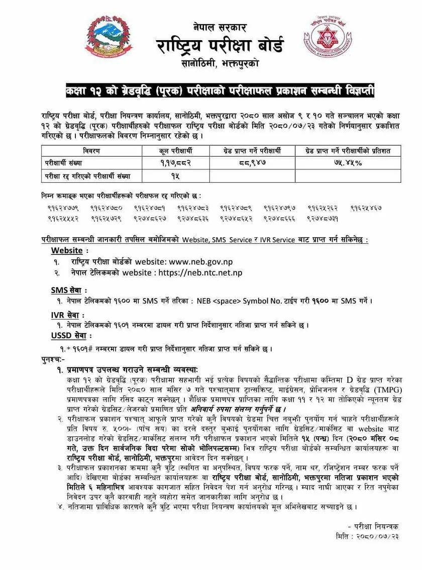 जसमा ८८ हजार ९४७ विद्यार्थीले ग्रेड प्राप्त गरेको राष्ट्रिय परीक्षा बोर्डले जनाएको छ। ७५.४५ प्रतिशत विद्यार्थीले ग्रेड प्राप्त गरेका हुन्। १५ जना विद्यार्थीको परीक्षा रद्द गरिएको बोर्डले जनाएको छ।