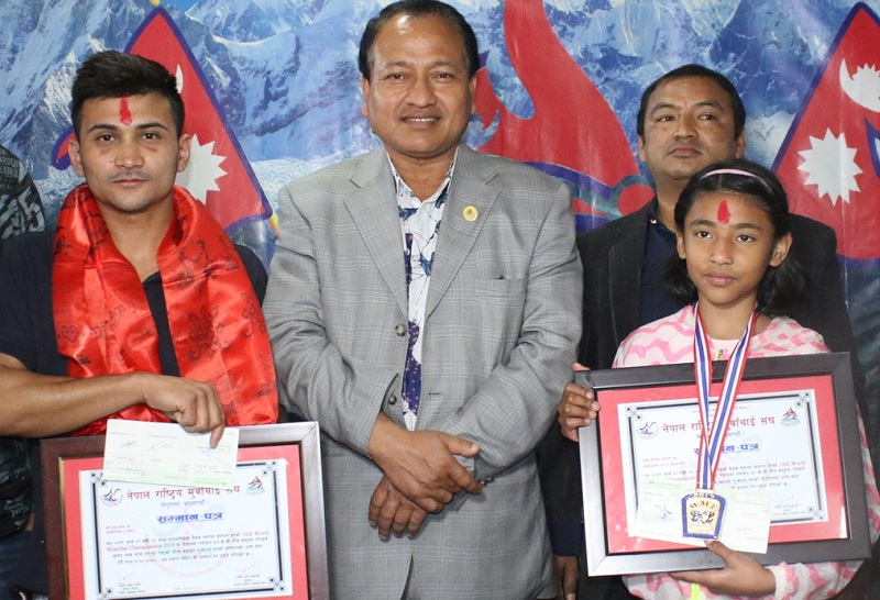 काठमाडौं । राष्ट्रिय मुवाँथाइ संघ नेपालले १६ औँ मुवाँथाइ विश्व च्याम्पियनसिपमा पदक जित्न सफल आफ्ना खेलाडीलाई शनिवार नगदसहित सम्मान गरेको छ ।