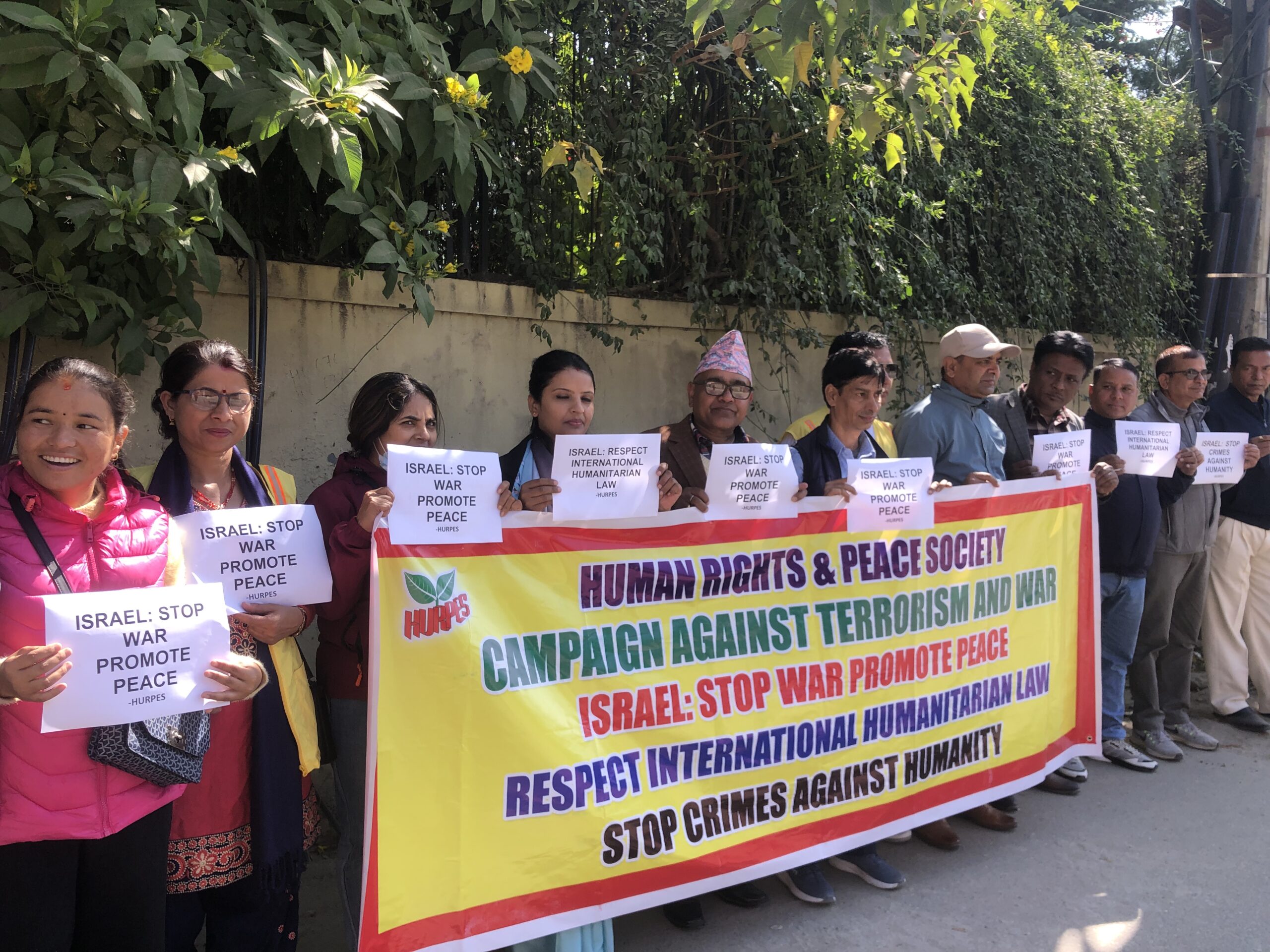युद्ध रोक्न र शान्ति प्रवद्र्धन गर्न इजरायललाई आग्रहसहित “युद्धविरामका लागि विश्वव्यापी आह्वानलाई स्विकार गर्न, अन्तर्राष्ट्रिय मानवीय कानूनको पालना गर्न र मानवता विरुद्धको अपराधलाई रोक्न” आह्वान गर्दै नेपालस्थित इजरायली राजदुतावास अगाडि प्रदर्शन गरिएको हो ।
