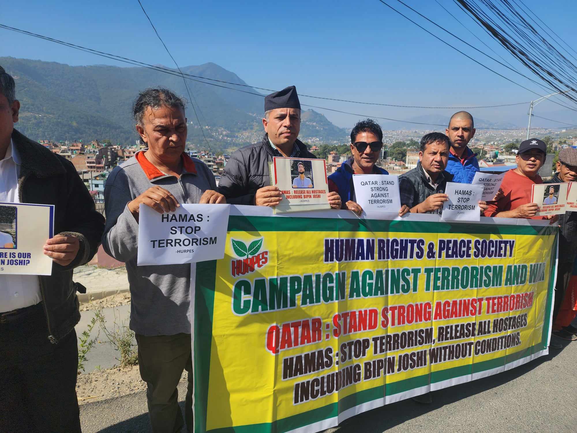 यसैगरी आतंकवाद विरुद्ध बलियोसँग उभिन कतारलाई आह्वान गर्दै सम्पन्न प्रदर्शनमा सन् २०२३ को अक्टोवर ७ का दिन हमासद्वारा इजरायलमा भएको आतंकी हमलाका दौरान हमासद्वारा बन्धक बनाइएका विपिन जोशी लगायत सबै बन्धकहरुको विना शर्त शिघ्र रिहाइका लागि जोड दिइएको छ । स्मरणीय छ, हमासका मुखिया इस्माइल हानीयेह कतारमा रहेको र खुला गतिबिधि गरिरहेको हुँदा कतार सरकारमार्फत जोशी लगायत सबै बन्धकहरुको रिहाईका लागि सार्थक पहल गर्न आग्रह गरिएको हो । कतारी दुतावास अगाडि चुन्नीखेल ललितपुरमा भएको प्रदर्शन पश्चात शान्ति समाजका तर्फबाट कतारका प्रधानमन्त्री शेख मोहम्मत विन अब्दुलरहमान विन जसिम अल थानीलाई लेखिएको ज्ञापनपत्र कतारी दुतावासमा बुझाइएको थियो ।