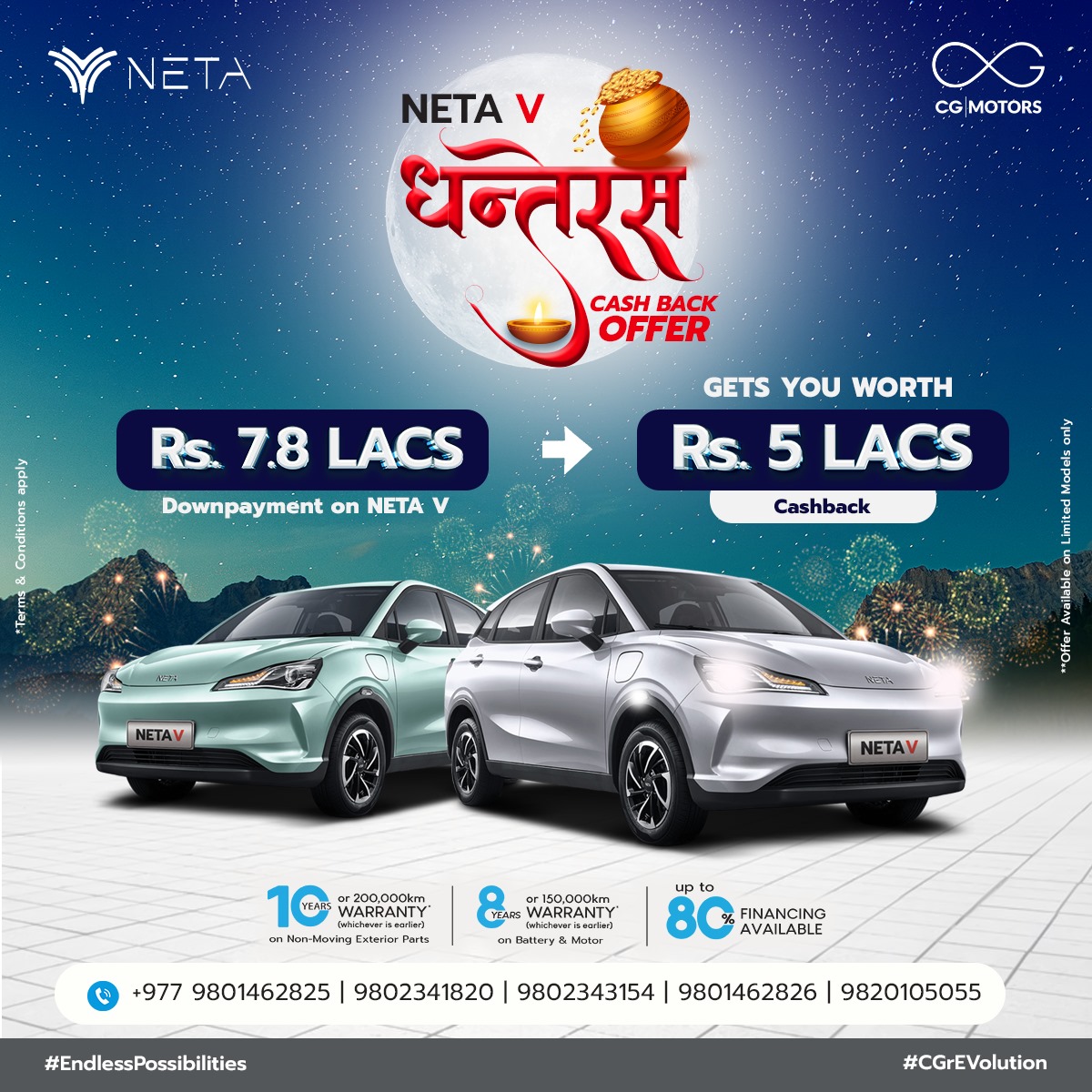 काठमाडौं । धन्तेरसमा नेटा भी विद्युतीय कार खरिदमा विशेष छुट योजना सार्वजनिक भएको छ । नेटा भीको नेपालका लागि आधिकारिक विक्रेता सीजी मोटर्सले विशेष अफर ल्याएको हो ।