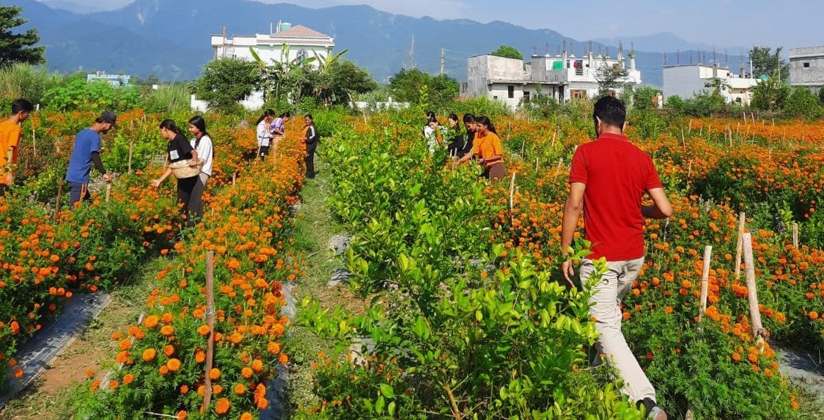 रुपन्देहीको बुटवल उपमहानगरपालिका–१५ चम्कीपुरस्थित फोकस मल्टी एग्रो कन्र्सन एण्ड रिर्सच सेन्टरमा ढकमक्क मखमली र सयपत्री फूल फुलेका छन् । दीपावली सुरूसँगै फार्ममा आबद्ध युवालाई फूलबारीमा फूल टिप्न र माला गाँस्न व्यस्त छन् । सञ्चालकसहित कृषि विषय अध्ययन गरेका विद्यार्थी ओजेटिको लागि आएकासमेत फूल टिप्न र माला बनाउन व्यस्त छन् ।