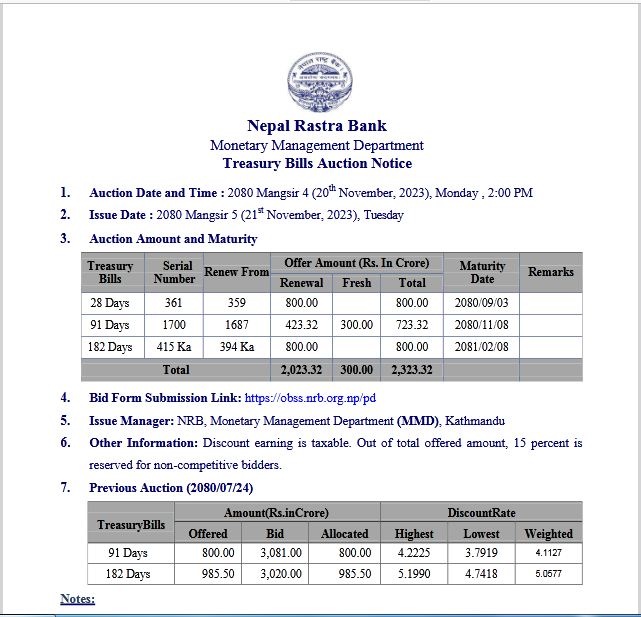 राष्ट्र बैंकका अनुसार बिक्री गरिने कुुल ट्रेजरी मध्येमा २८ दिने अवधिको आठ अर्ब, ९१ दिने अवधिको सात अर्ब २३ करोड ३२ लाख र एक सय ८२ दिने अवधिको आठ अर्ब रुपैंयाँ बराबरको रहेको छ । यि ट्रेजरीहरुको परिपक्व हुने अवधि भने क्रमशः २०८० पुस तीन गते, २०८० फागुन आठ गते र २०८१ जेठ आठ गते तोकिएका छन् । यि ट्रेजरीहरुमा ९१ दिने अवधिको तीन अर्ब रुपैंयाँको ट्रेजरी बिल नयाँ भएपनि बाँकी भने सबै पुरानो नवीकरण अन्र्तगतको रहेको राष्ट्र बैंकले जनाएको छ ।