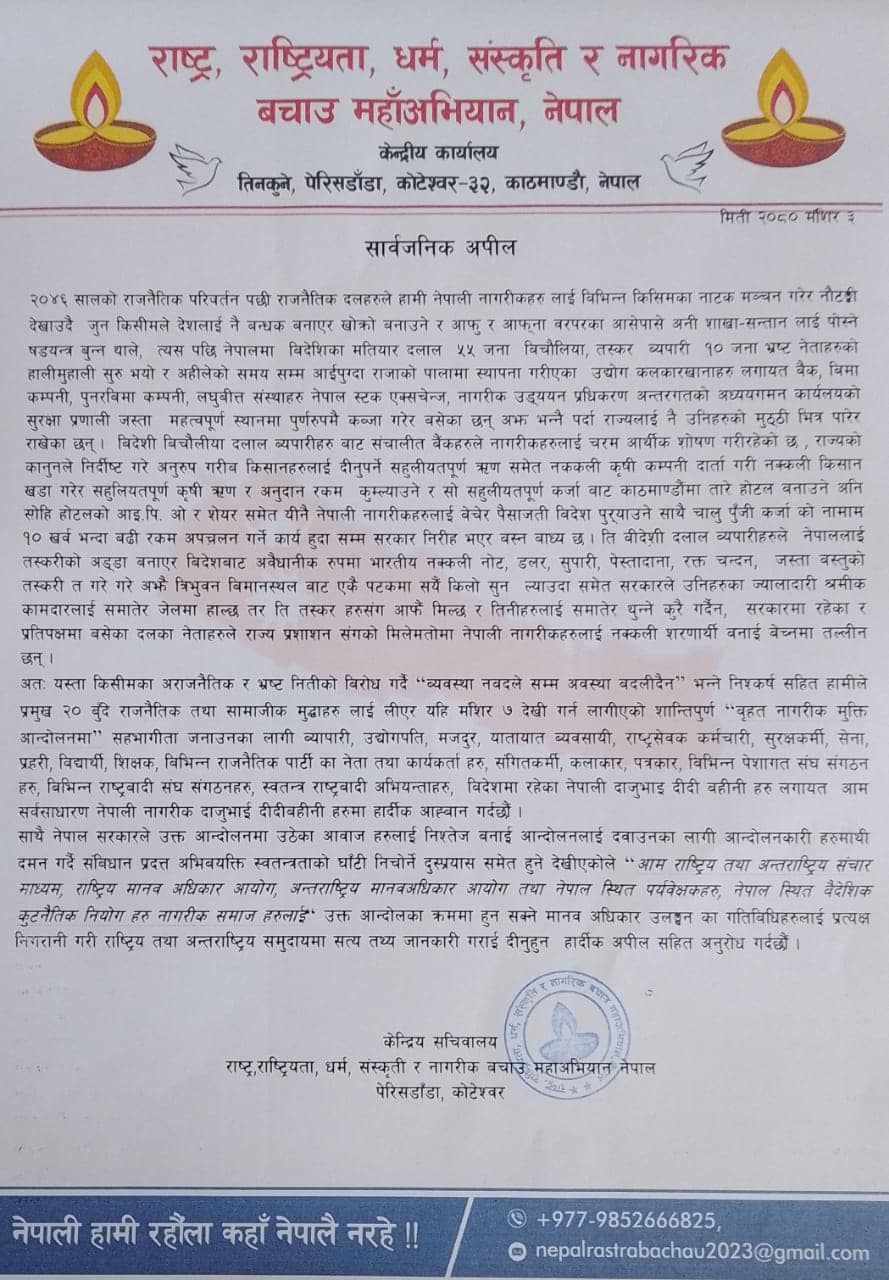आन्दोलनमा सरकारबाट दमन हुनसक्ने भन्दै नागरिक बचाउ महाअभियानले माग्यो गुहार (विज्ञप्तिसहित)