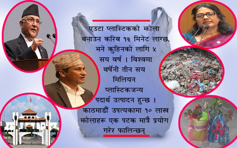 काठमाडौं उपत्यकामा १० लाख झोलाहरु एक पटक मात्रै प्रयोग गरेर फालिने अनुसन्धानले देखाएको छ । १० लाख प्लास्टिकका झोलाहरुले जम्मा भएका फोहोरहरु मध्य ११ प्रतिशत ठाउँ ओगटेको हुन्छ । नेपालमा प्रत्येक दिन २ सय ४ टन मात्रै प्लास्टिकका फोहोरहरु थुप्रने तथ्यांक रहेको छ भने ४ सयदेखि ५ सय वर्ष ती प्लास्टिकहरुलाई कुहिनको लागि समय चाहिन्छ ।
