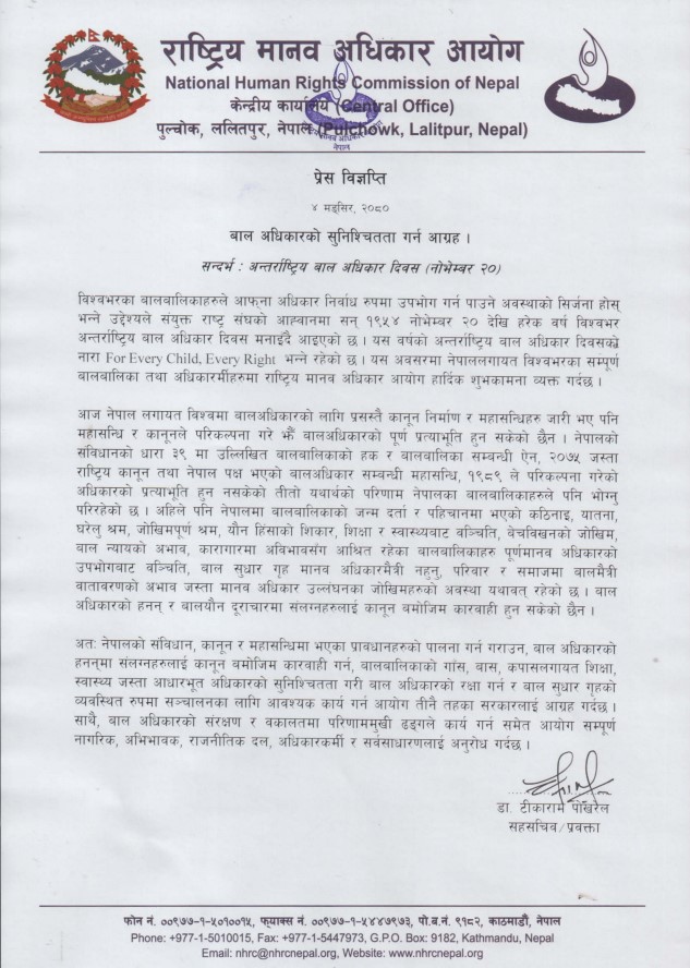 आयोगका सहसचिव डा.टीकाराम पोखरेलद्वारा जारी विज्ञप्तिमा भनिएको छ, ‘अहिले पनि नेपालमा बालबालिकाको जन्म दर्ता र पहिचानमा भएको कठिनाई, यातना, घरेलु श्रम, जोखिमपूर्ण श्रम, यौन हिंसाको शिकार, शिक्षा र स्वास्थ्यबाट वञ्चिति, बेचविखनको जोखिम, बाल न्यायको अभाव, कारागारमा अभिभावसँग आश्रित रहेका बालबालिकाहरु पूर्ण मानव अधिकारको उपभोगबाट वञ्चिति छन् ।’