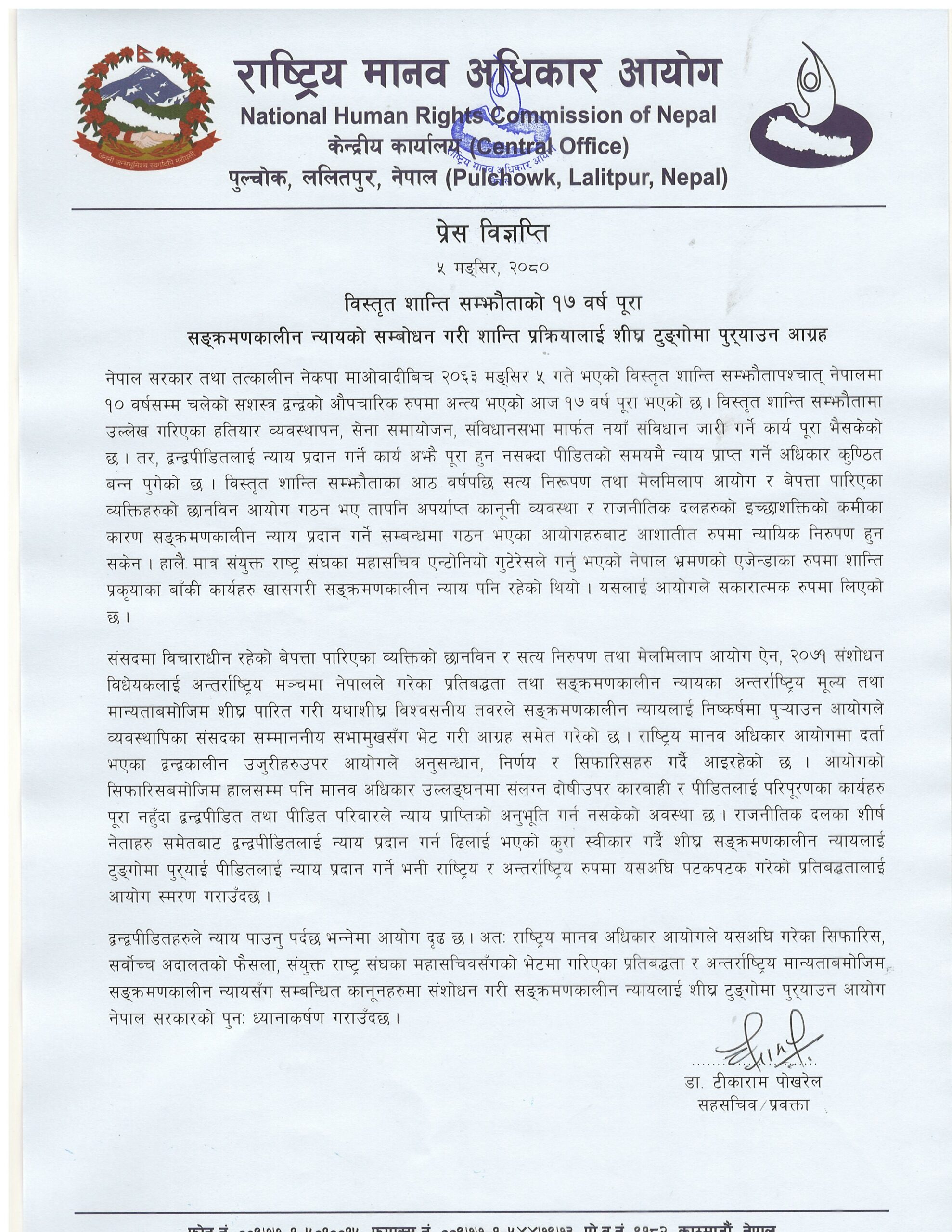 विज्ञप्तिमा भनिएको छ, ‘राष्ट्रिय मानवअधिकार आयोगमा दर्ता भएका द्वन्द्वकालीन उजुरीहरुउपर आयोगले अनुसन्धान, निर्णय र सिफारिसहरु गर्दै आएको छ । आयोगको सिफारिसबमोजिम हालसम्म पनि मानवअधिकार उल्लंघनमां संलग्न दोषीउपर कारवाही र पीडितलाई परिपुरणका कार्यहरु पूरा नहुँदा द्वन्द्वपीडित तथा पीडित परिवारले न्याय प्राप्तिको अनुभूति गर्न नसकेको अवस्था छ । राजनीतिक दलका शीर्ष नेताहरु समेतबाट द्वन्द्वपीडितलाई न्याय प्रदान गर्न ढिलाई भएको कुरा स्वीकार गर्दै संक्रमणकालीन न्यायलाई टुंगोमा पुर्याई पीडितलाई न्याय प्रदान गर्न भनी राष्ट्रिय र अन्तर्राष्ट्रिय रुपमा यसअघि सरकारले पटकपटक गरेको प्रतिवद्धतालाई आयोग स्मरण गराउँदछ ।’
