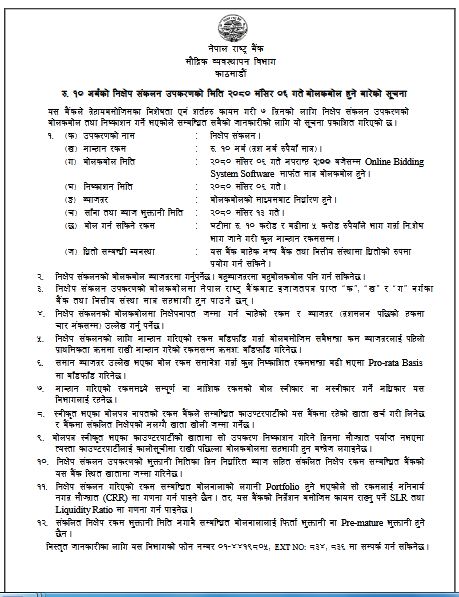 आज बुधबार अपरान्ह दुुई बजेसम्ममा बोलकवोलको माध्यमद्धारा उक्त परिमाणको निक्षेप उपकरण बिक्री गर्न लागिएको राष्ट्र बैंकले जानकारी दिएको छ ।