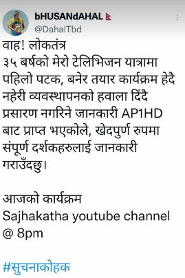 उनले ट्वीटमा भनेका छन्, ‘वाह! लोकतंत्र ३५ बर्षको मेरो टेलिभिजन यात्रामा पहिलो पटक, बनेर तयार कार्यक्रम हेदै नहेरी व्यवस्थापनको हवाला दिंदै प्रसारण नगरिने जानकारी AP1HD बाट प्राप्त भएकोले, खेदपुर्ण रुपमा संपूर्ण दर्शकहरुलाई जानकारी गराउँदछु। आजको कार्यक्रम Sajhakatha youtube channel @ 8pm’
