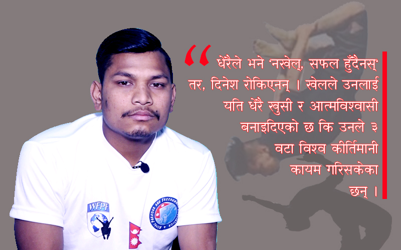 ‘विश्वको कुनै खेलाडीले आफ्नै कीर्तिमानी तोड्दै ३ पटकसम्म रेकर्ड राखेको छैन’, गर्विलो आवाजमा उनले भने, ‘अझै ६, ७ पटक आफ्नै रेकर्ड तोड्ने सपना छ ।’
