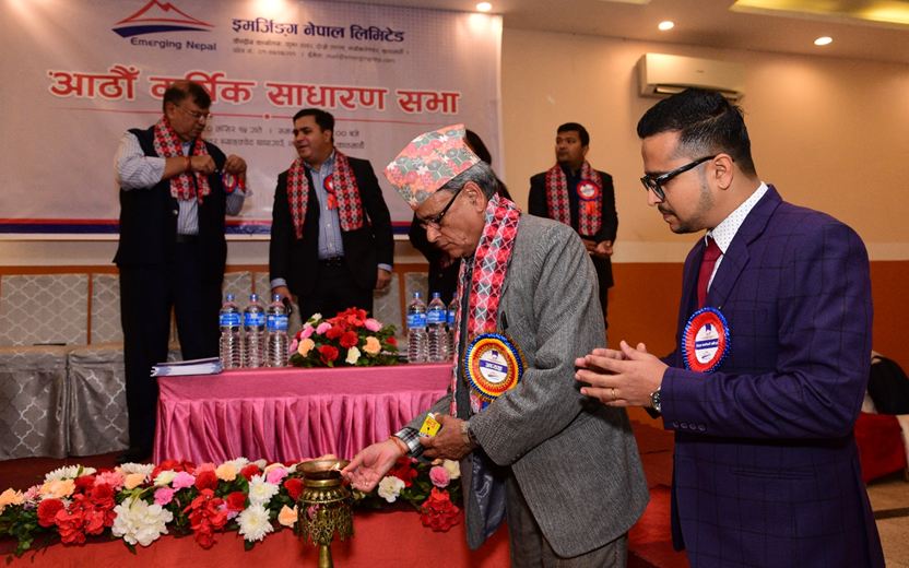 काठमाडौं । इमर्जिङ्ग नेपाल लिमिटेडको आठौँ वार्षिक साधारण सभा सम्पन्न भएको छ । कम्पनीले शुक्रबार बानेश्वर ब्याङक्वेट, थापागाँउ, नयाँ बानेश्वर काठमाण्डौँमा वार्षिक साधारण सभा सम्पन्न गरेको हो ।