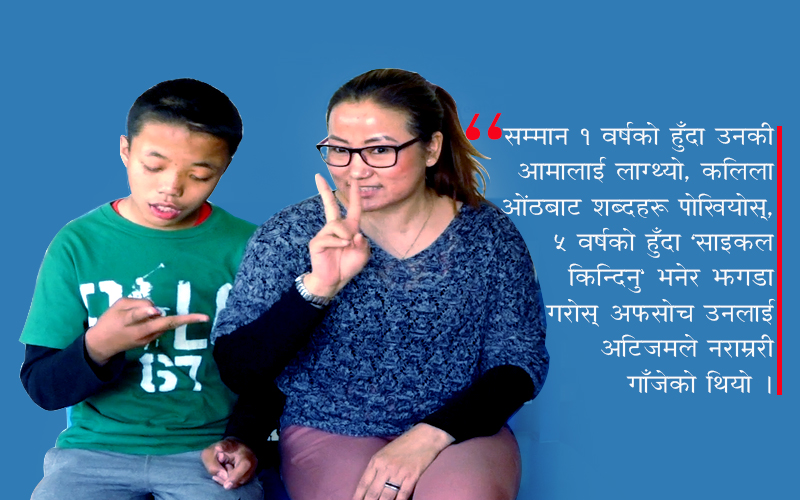 धनु, सम्मानकी आमा, आफ्नो एक्लो छोरालाई विगत १० वर्षदेखि यस्तो अवस्थामा देखिरहेकी छिन् । सम्मान ३ वर्षको हुँदै उनमा ‘अटिजम’ भएको पत्ता लागिसकेको जो थियो । अटिजम अर्थात् यस्तो मानसिक अवस्था जो जन्मजात हो र मृत्युपर्यन्त रहन्छ ।