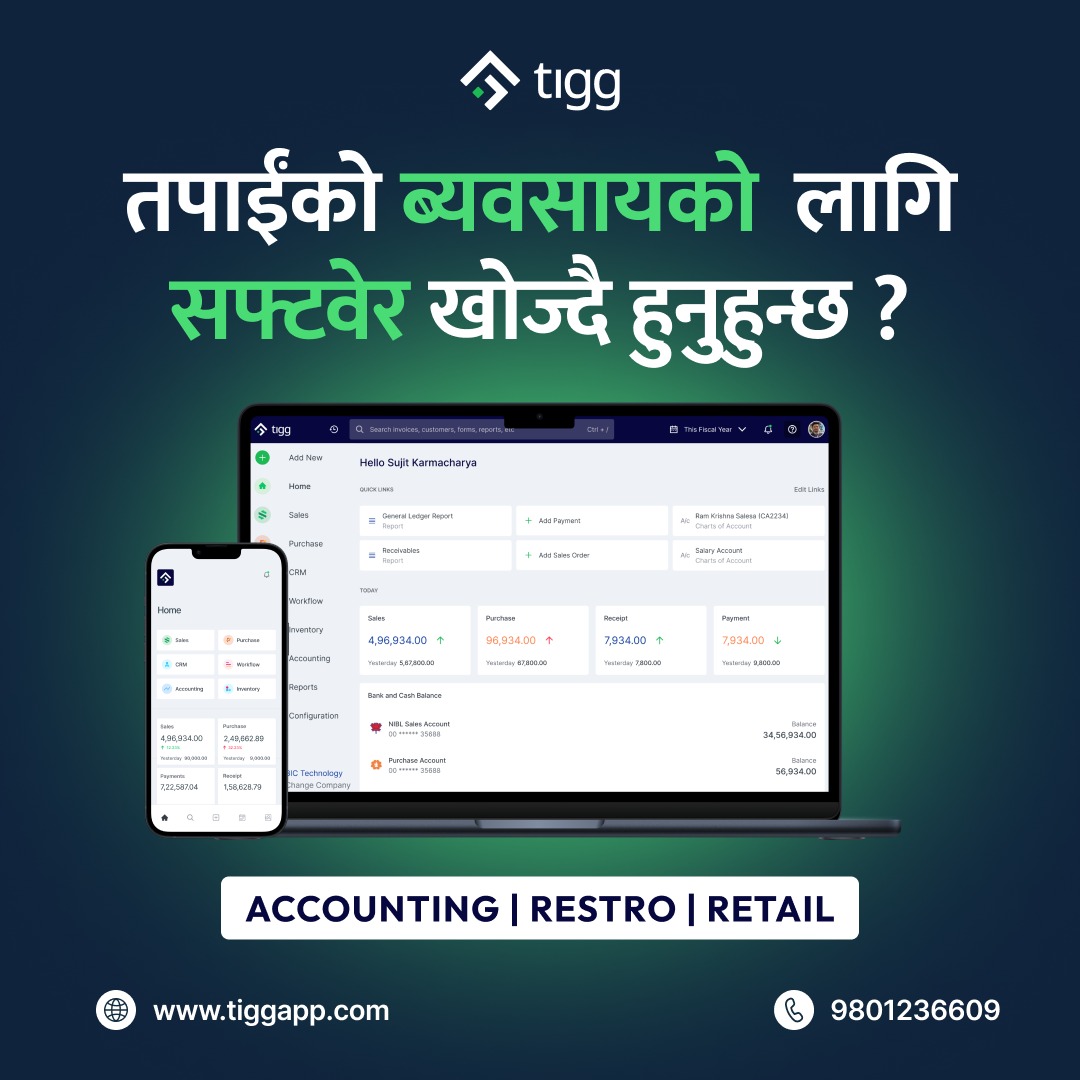 टिगको लक्ष्य साना तथा मझौला व्यवसायलाई डिजिटल बनाउनु हो,’ उनले भने, ‘त्यसै अनुसार टिगमा रेष्टुरेन्ट, साना मार्ट, होलसेल र रिटेल पसललाई एउटै प्लेटफर्मबाट व्यवस्थापन गर्न सकिने गरी नयाँ सुविधा ल्याएका छौं । टिगमा अकाउन्टिङ र स्टक व्यवस्थापन सुविधा यसअघि देखि नै उपलब्ध छ ।’ रेस्टुरेण्ट, क्याफे वा मार्ट व्यवसायीहरुले सफ्टवेयरको डेमो निःशुल्क रूपमा हेर्न सक्ने व्यवस्था मिलाईएको छ । यस बाहेक टिगले व्यवसायीलाई तालिम समेत उपलब्ध गराउँदै आएको छ । सफ्टवेयर प्रयोग गर्न चाहने सबैका लागि निशुल्क अनलाइन तालिमको व्यवस्था गरिएको टिगकी सह–संस्थापक प्राथना शाखःले बताइन ।