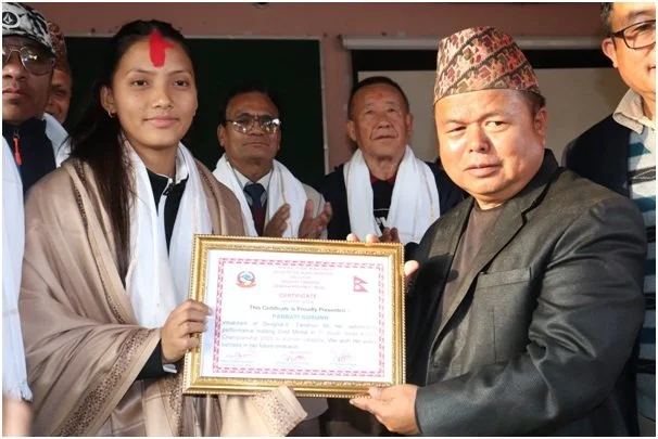 उक्त प्रतियोगितामा स्वर्ण पदक विजेता देवघाट गाउँपालिका–५ गैडाढुङ्गा निवासी गुरुङलाई गाउँपालिकाले शुक्रबार नगद रु २५ हजारसहित सम्मान गरेको हो । गाउँपालिकाका अध्यक्ष तिलबहादुर थापाले गुरुङलाई रु २५ हजार नगद र प्रमाणपत्र प्रदान गरे ।