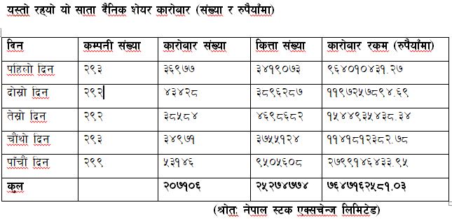यो साता नेप्सेमा दुुई सय ९९ वटा कम्पनीहरुको सेयर किनबेच भयो । जसबाट दुई लाख सात हजार एक सय छ पटकको कारोबारमा दुई करोड ५२ लाख ७४ हजार सात सय ७४ कित्ता शेयर किनबेच हुँदा कुल कारोबार रकम सात अर्ब ६४ करोड ७१ लाख ६२ हजार पाँच सय ८१ रुपैंयाँ तीन पैसा पुगेको छ । यो कारोबार रकम गत साता कै बराबरको हो । गत साता भने यस्तो कारोबार रकम सात अर्ब ३८ करोड ४४ लाख ५८ हजार १८ रुपैंयाँ रहेको थियो । कुल दुुई सय ९४ वटा कम्पनीहरुको दुई लाख ३३ हजार दुई सय ४३ पटकको कारोबारमा दुई करोड ५२ लाख ३१ हजार ९६ कित्ता शेयर किनबेच हुँदा उक्त परिमाणमा रकम कारोबार भएको थियो ।